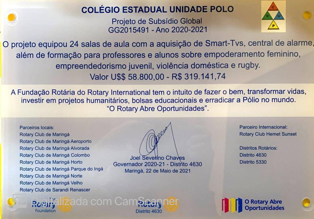 O projeto equipou 24 salas de aula com smart-tvs, central de alarme e ainda formação de professoras e alunos sobre empoderamento femino, empreendendorismo juvenil, violencia doméstica e rugby. Parceria dos Rotarys Clubs de Maringá e Sarandi, Club Hemet Sunset e Distritos 4630 e 5330 de Rotary International. Parabéns a todos os envovidos. Valor do projeto R$ 319.141,71 ou US$ 58.800,00.