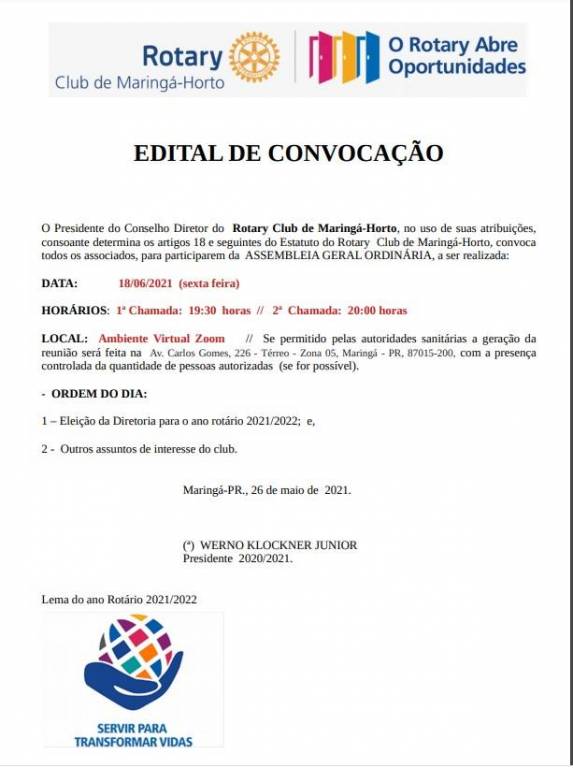 EDITAL DE CONVOCAÇÃO para eleição do Conselho Diretor 2021/2022. A Assembléia Geral será realizada na proxima semana para formalizar a eleição do novo Conselho Diretor