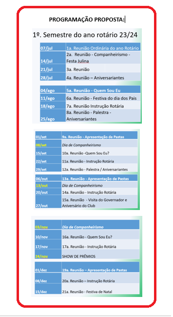 PROPOSTA DE CALENDÁRIO - 1. SEMESTRE ano rotário 2023/2024.