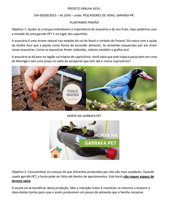 Projeto Gralha Azul, consiste na produção da muda de araucária, para posteiror plantio em locais indicados pelos municipios de Maringá e Sarandi, além de aproveitamento das garafas onde foram produzidas as mudas para elaboração da horta, o projeto esta sendo realizado em parceria com a entidade Pescadores de Vidas da cidade de Sarandi-PR., contando com a particiação de todos os assistidos pela entidade, além de motivar a produção de mudas de arvores e hotaliças, ainda auxilia a meio ambiante com o plantio das mudas e reaproveitamento de garafas pet.