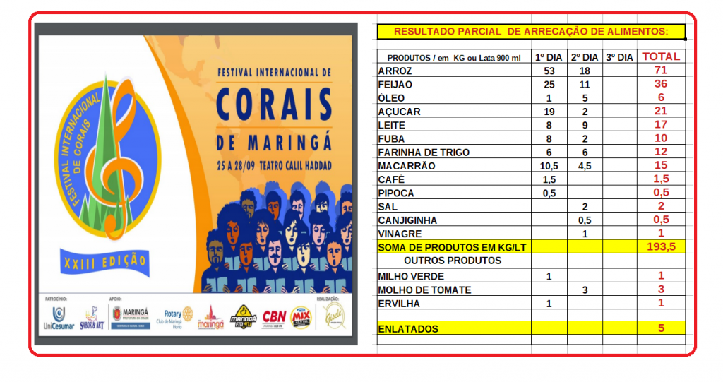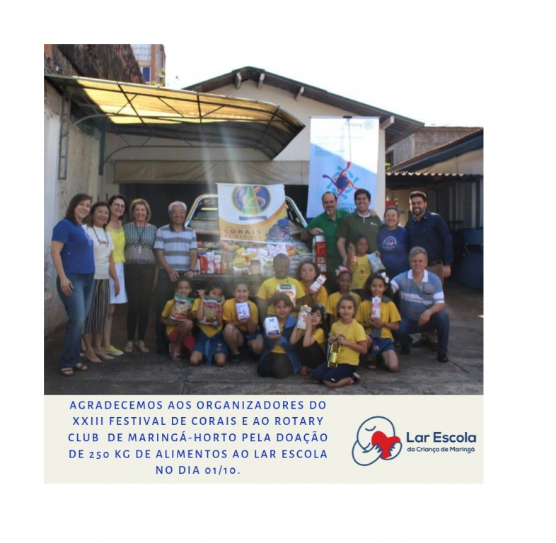 AÇÃO DO ROTARY CLUB DE MARINGÁ HORTO, em parceria com GISELE PRODUÇÕES ARTISTICAS, realizadadora do XXIII FESTIVAL DE CORRAIS DE MARINGÁ, arrecadou 501 kg de alimentos que foram doados a ALBERQUE SANTA LUZIA DE MARILAC e LAR ESCOLA DA CRIANÇA. Parábens aos organizadores, parceiros e colaboradores.