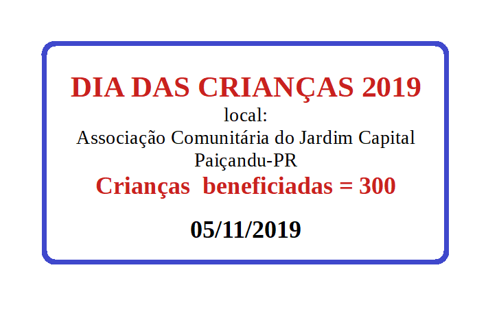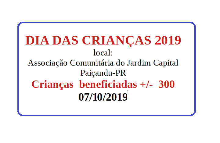 DIA DAS CRIANÇAS, na Associação Comunitária do Jardim Capital da cidade de Paiçandu-PR., ação do ROTARY CLUB DE MARINGÁ HORTO, em parceria da Associação Comunitária local, com os palhaços da Operção Gargalhada de Maringá (Celeste, Donatella, Lamparina, Manjericão, Monalisa e Suspiro), colaboração de Leandro da Silva Oliveira, Fátima Silva, Ilma Bimbato, Lúcia Benegacci, Rosa Gali e da Familia Telles, além da GELA BOCA SORVETES. Nosso muito obrigado a todos.